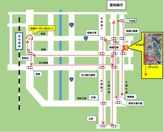 オアシス21緑の大地をスタートし、栄、名古屋駅周辺を通り、再びオアシ