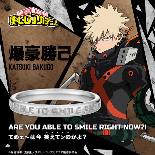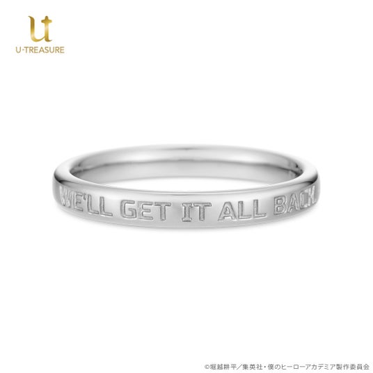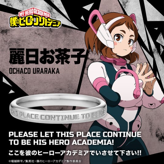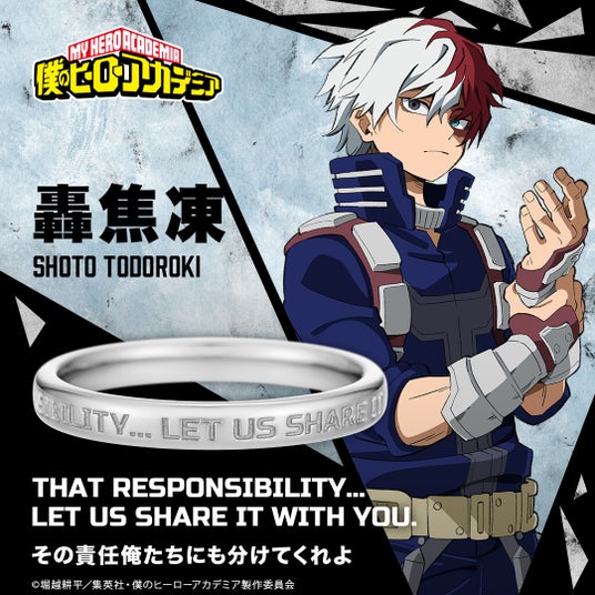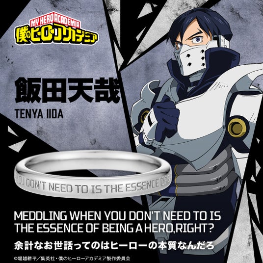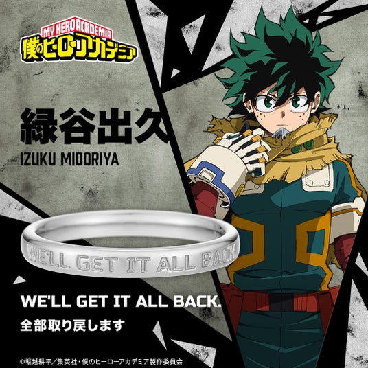 このたびの新作は、TVアニメ『僕のヒーローアカデミア』に登場する、緑谷出久、爆豪勝己、麗日お茶子、飯田天哉、轟焦凍、それぞれのセリフの英語版を抜粋し刻印したメッセージリングです。