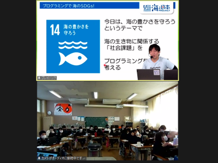 SDGs課題14「海の豊かさを守ろう」をテーマに、Scratchのブロックプログラミングを通した社会課題解決の可能性を学習しました。