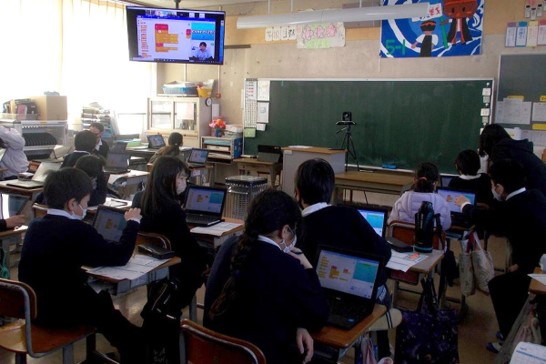 5年生2クラスを対象に、SDGs × Scratchプログラミングのオンライン出前授業を行いました。今回の授業は、小学校各教室にあるモニターを介して実施しました。プログラミングの学習では、仮想の海にいるおなかがすいたシャチに、魚の場所を教えて食べさせてあげるプログラムを組むことに挑戦しました。授業の前半では、Scratchの操作の仕方や注意点について説明しましたが、オンラインでも児童の皆さんが真剣に話を聞いている様子が伺えました。SDGsの紹介では、質問を投げかけるとジェスチャーや手を挙げて元気に答えてくれていました。