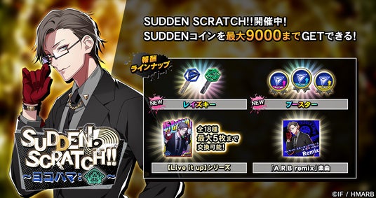 イベント期間中、KILLER SCRATCH!!をプレイするとライズ消費量に応じた確率でSUDDEN SCRATCH!!が発生します。SUDDEN SCRATCH!!をプレイすると、通常の報酬アイテムの他、限定アイテム「SUDDENコイン」を獲得することができます。「SUDDENコイン」を集めることで、レイズキーやヨコハマ・ディビジョンのデコステッカーに使えるブースターなどと交換することが可能です。他にも、ストーリーカードの【Live it up】シリーズ、「A.R.B remix」楽曲などがラインナップされています。詳細はアプリ内お知らせをご確認ください。