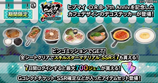 原作プロジェクト「ヒプノシスマイク -Division Rap Battle-」の7周年を記念して、ビンゴミッションや7日間のログインで700ジェムを獲得できるログインボーナスなどを実施しています。また、オフィシャルカフェ「ヒプノシスマイク -Division Rap Battle- 7th ANNIVERSARY CAFE」メニューをデザインしたデコステッカーも登場します。詳細はアプリ内お知らせをご確認ください。