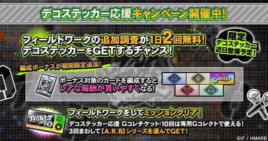 フィールドワークの追加調査が1日2回無料になるほか、編成してフィールドワークを行うとレアな報酬が獲得しやすくなる編成ボーナスの対象が期間限定で追加されるなど、デコステッカーを入手しやすくなるキャンペーンを実施しています。本キャンペーン中のログインやミッションクリアでデコステッカー応援 Gコレチケット:10回が最大3枚獲得でき、対応するGコレクトを回すことで【A.R.B】シリーズのSSRカードを入手できます。