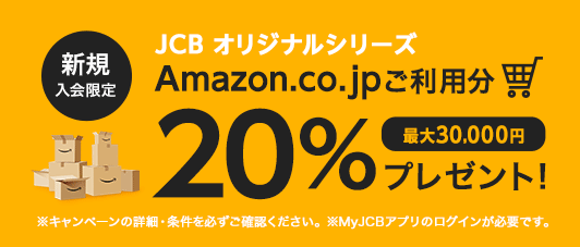 JCBオリジナルシリーズは、Amazon.co.jpでのお買い物で常にOki Dokiポイントが3倍~4倍となるおトクなカードです。本キャンペーン実施中に新規入会後、MyJCBアプリにログインし、Amazon.co.jpをご利用いただくと、通常のポイント獲得に加え、ご利用分の20%(最大30,000円)がキャッシュバックされます。