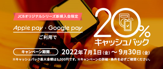 期間中に新規入会後、MyJCBアプリにログインし、入会したカードをApple Payまたは Google Pay に設定し利用すると、ご利用分の20%(最大5,000円)がキャッシュバックされます。