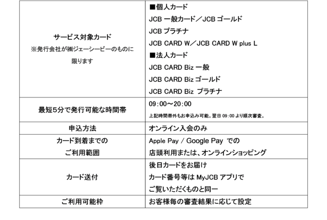 モバイル即時入会サービスでは、対象のクレジットカードへのオンライン入会申込からカード番号等の発行までが最短5分で完了し、以下の範囲でお申込み即日からご利用いただけます。