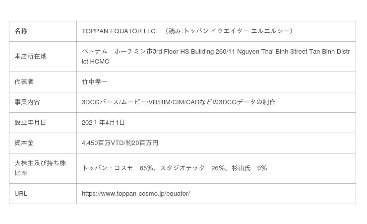 凸版印刷株式会社(本社:東京都文京区、代表取締役社長:麿 秀晴)のグループ会社である、株式会社トッパン・コスモ(本社:東京都港区、代表取締役社長:橋本 敦史、以下 トッパン・コスモ)は、日本国内の建築/インテリア/設備機器業界に向けて、販売促進やプレゼンテーションを目的とした高品質3DCGのコンテンツ制作を業務目的とする新会社「TOPPAN EQUATOR LLC」を、有限会社スタジオテック(本社:大阪府羽曳野市、代表取締役:佐野 眞士、以下 スタジオテック)と杉山貴伸氏(Nu Design and Supply Co., Ltd. 代表、ベトナム ホーチミン市、以下NDS)の3者共同で2021年4月1日(木)に設立しました。