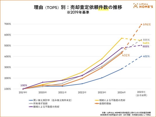 【売却査定依頼件数の推移】「金銭的理由」は24年では19年の4.3倍に増加、25年はさらなる増加が見込まれる