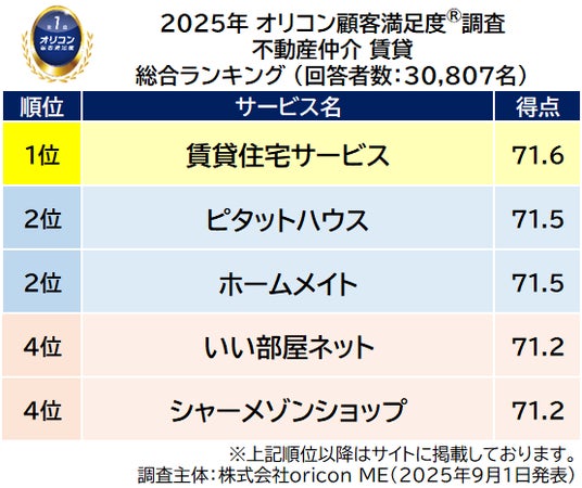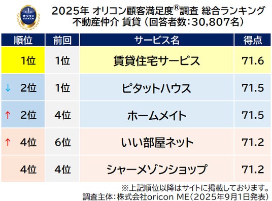 オリコン株式会社(本社:東京都港区 代表取締役社長:小池 恒、略称:オリコン)は、グループ会社である株式会社oricon MEが、実際のサービス利用者を対象に第三者の立場で実施した『不動産仲介 賃貸』の顧客満足度調査の結果を、2025年9月1日(月)14時に「オリコン顧客満足度(R)」公式サイト内にて発表いたしました。ランキング結果は、下記の通りとなりました。