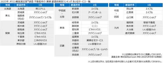 『不動産仲介 賃貸』都道府県別ランキング(オリコン顧客満足度)