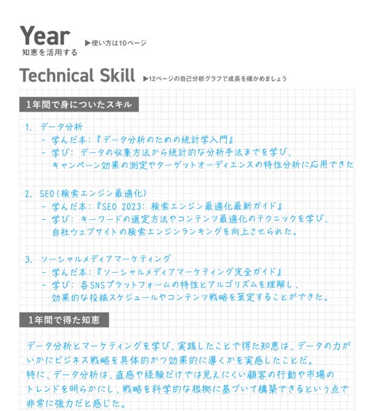 「Year」のページで3つのスキルごとにどんなスキルが身についたか、それらをどう活かしていきたいかを書きます。