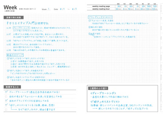 「Week」のページは自由度が高く、自分の好きな書き方ができるようになっています。巻頭の記入事例を参考にしながら、自分だけの読書手帳が出来上がります。