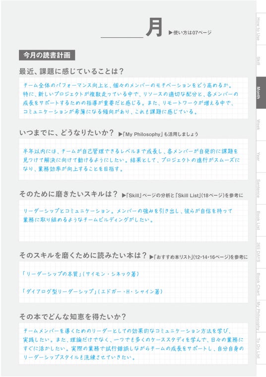 月の初めに「Month」のページを活用し、課題を洗い出して、毎月の課題図書を決めます。その際にも「おすすめ本リスト」が参考になります。