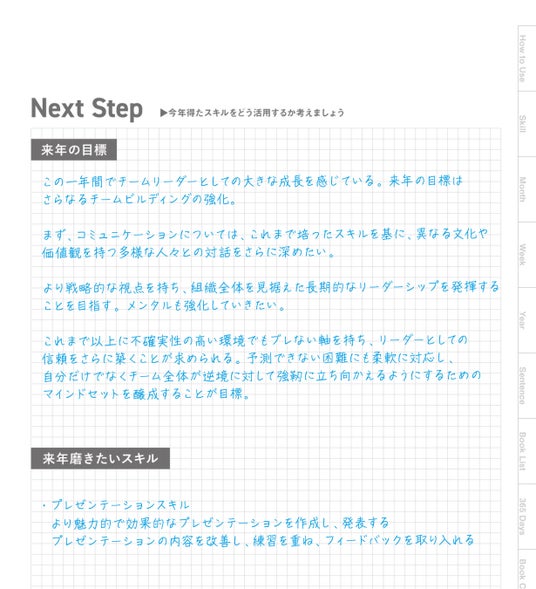 この手帳は使って終わりではありません。1年間に学んだことを活かして、これからどう過ごしていきたいか。翌年の目標を書くことで、さらなる成長を目指すことができます。
