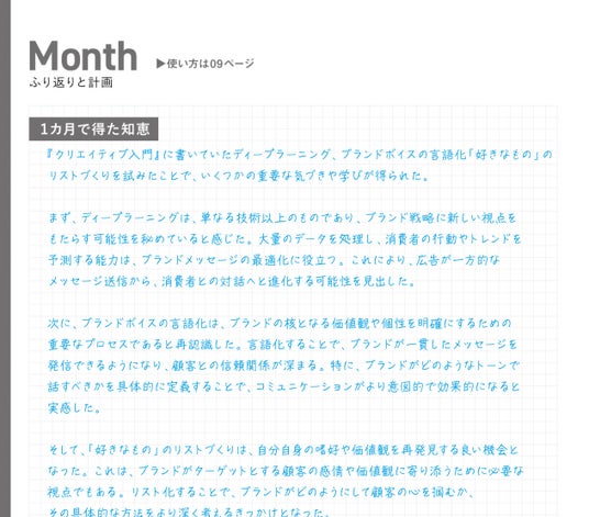 「Week」ページの「1週間のふり返り」欄に書いた内容を参考にすることができます。