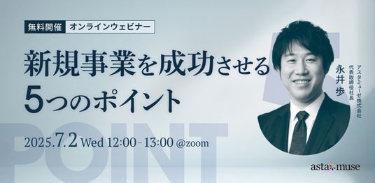 アスタミューゼ株式会社(本社:東京都千代田区、代表取締役社長 永井歩)は、2025年7月2日(水)12:00-13:00に、経営企画・事業戦略担当者、新規事業担当者向けの無料ウェビナー「新規事業を成功させる5つのポイント」開催します。2月にも実施した同タイトルのウェビナーがご好評のため、再開催となります。