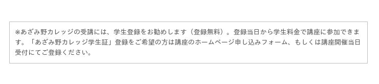 [学生証]あざみ野カレッジ学生証あざみ野カレッジの受講には、学生登録をお勧めします(登録無料)。登録当日から学生料金で講座に参加できます。「あざみ野カレッジ学生証」登録をご希望の方は講座のホームページ申し込みフォーム、もしくは講座開催当日受付にてご登録ください。