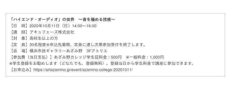 コロナ禍で巣ごもりが続いていますが、テレビやラジオ、オーディオで音楽を楽しんでいる方も多いでしょう。たとえばラジカセの音。ラジオやテレビから流れてくる音。そうした普段聴いている「音」と「オーディオ装置の音」はどれだけ違うのでしょうか?今回は、「音にこだわり、自分たちの理想とするオーディオを創る」という理念のもと創業されたアキュフェーズ株式会社をお招きして、「音を極める技術」者に、ご自宅にある音響機器でも、いい「音」が聴けるコツを教えていただきます。それだけではなく、究極の「ハイエンド・オーディオ」の「音」へのこだわりについて学びます。同社はあざみ野駅近くに拠点を構え、アートフォーラムあざみ野では同社製のオーディオでロビーコンサートを開催しています(9/27・10/11・25)。スピーカーはTAD社製品を使用しています。