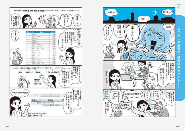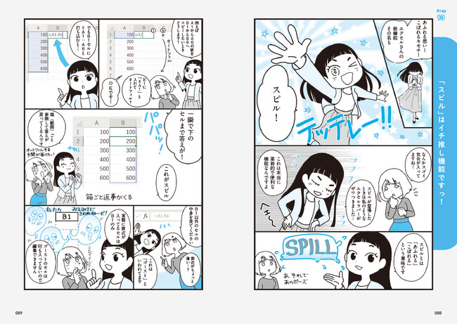 本書は、Excelに熟達したワンランク上の人材派遣サービス「EXCEL女子」による研修を基に構成されており、Excelの基本から各種関数の活用法やデータベースの管理と運用までを段階的に学べます。各Stepはマンガパートと解説パートに分かれており、初心者でも楽しく&わかりやすくExcelのテクニックが身につきます。また、「スピル」や「XLOOKUP」といった最新機能・関数の使い方も紹介しており、日々の実務をより効率的に行えるようになれます。