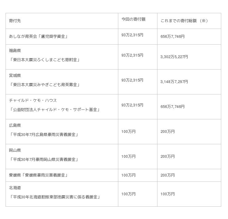※2015年3月には、「平成26年8月豪雨」(広島土砂災害)に57万468円、2016年9月、2017年3月には、「平成28年熊本地震災害義援金」に、計 464万8,218円、2017年9月には、「平成29年7月5日からの大雨災害義援金」(九州北部地方大雨災害)に100万円をそれぞれ寄付しています。