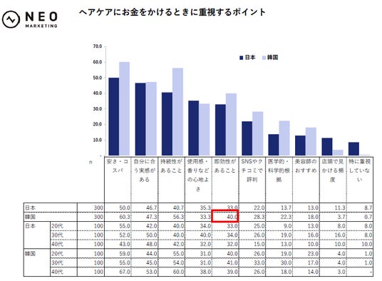 ヘアケアにお金をかけるときに重視するポイントを聞いたところ、「安さ・コスパ」「自分に合う実感がある」「持続性があること」が、日本と韓国の両方で上位3位を占めました。一方、韓国では「即効性があること」を重視する回答も比較的多く見られました。