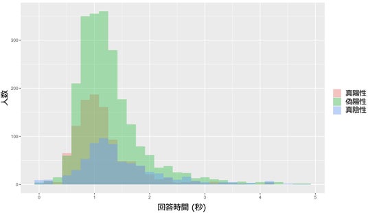 その結果、「調査で購入意向を表明した人のうち、その後実際に購入しない人(偽陽性)」、「調査で購入意向を表明せず、かつその後購入しなかった人(偽陰性)」よりも、「調査で購入意向を表明し、その後実際に購入する人(真陽性)」の方が速い回答になることが確認されました。