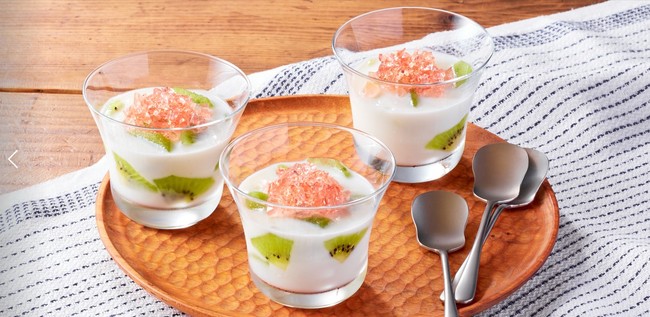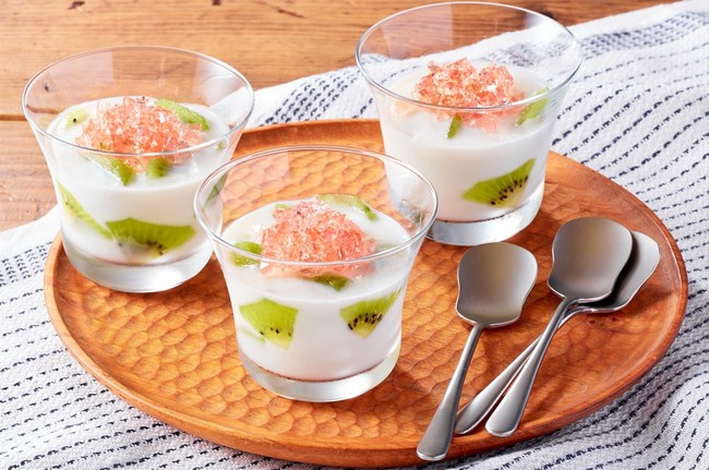 電子レンジ加熱して材料を混ぜ、冷やし固めるといった簡単な手順で作れる冷たい牛乳寒天は、相性の良いキウイといちごのシロップがアクセントに。調理を通じて身近な食の知識やフードロスの課題について学べ、お子さまが主体的に取り組むことができるミールキットです。