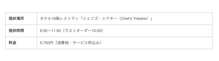 朝食: 06:30 ~ 11:00 (L.O. 10:00)