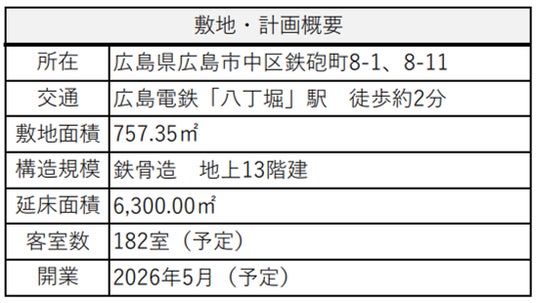 本計画は、広島駅から車で約5分・広島電鉄「八丁堀」駅から徒歩約 2 分とアクセス性に優れた立地に、中国エリア初進出となる「(仮称)東急ステイ広島」を 2026 年 5 月に開業予定で、当社が運営を行うものです。地上 13 階建て、客室数 182 室、客室平均面積は 23 平方メートル と広めの設定で、長期滞在に相応しい施設になっております。中四国地方最大の繁華街からほど近く、世界遺産である原爆ドームや厳島神社などの観光名所へもアクセスしやすいため、国内観光客だけでなく訪日観光客も多く見込んでおり、多様化しているお客様がホテルに求める体験価値やニーズにもお応えできるホテルを目指します。