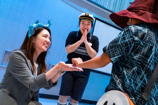 第2部では今年新設した“クルーのお仕事体験”プログラムに挑戦。各施設・部門からボランティア参加したクルーたちがお手本となり、エンターテイナー、ゲストとのコミュニケーション、装飾、音響、セキュリティ、店舗のグッズ陳列・販売、など様々な仕事に子どもたちがチャレンジし、キラキラと目を輝かせながら“働くことの重要性”をしっかりと体感しました。