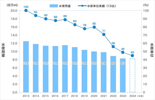 2023年度は工業用水の受け入れ量の見直しや洗浄水の多段利用、配管更新による漏洩対策などを実施し、水使用量で2013年度比34%、水原単位で51%の削減となり、計画を大幅に達成することができました。