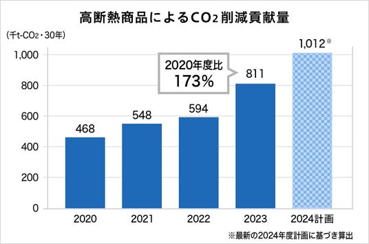 「商品」では、トリプルガラス仕様でトップクラスの断熱性能を持つ木製窓「APW 651」大開口スライディングを2024年7月に発売。ビル用の高断熱商品となるアルミ樹脂複合窓「EXIMA 55」も2024年9月に発売を予定しています。このように戸建住宅やマンションなどにおいても高断熱窓を拡充することで、「CO2削減貢献量」を2024年度は2020年度比216%の達成を目指します。