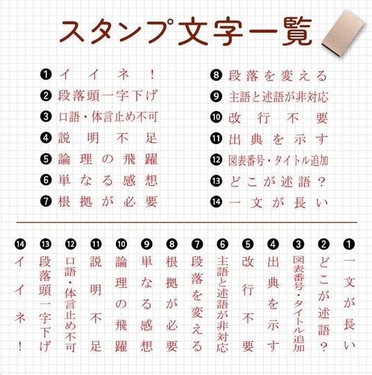 スタンプの文字は「説明不足」や「論理の飛躍」、「単なる感想」「出典を示す」「一文が長い」など、添削でよく使われる文言で構成した合計14個セットとなります。レポートや卒業論文の形式にあわせて、横書き・縦書きも選べます。