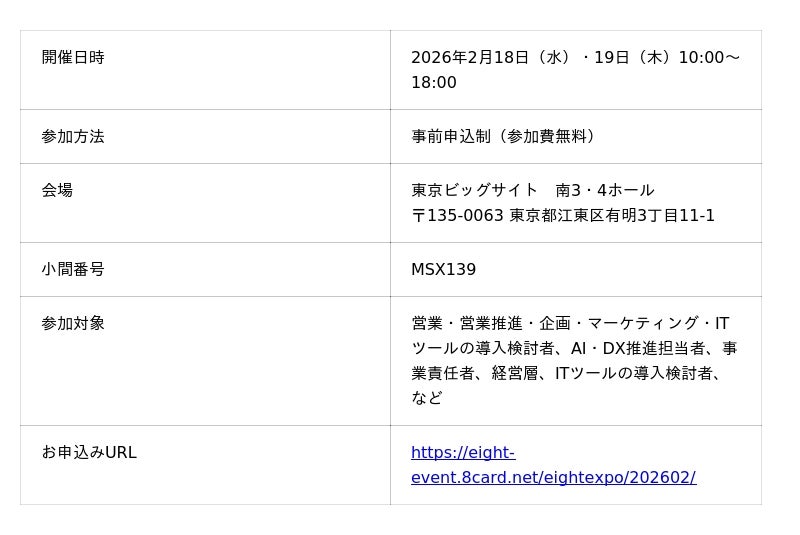 株式会社ネオマーケティング(本社:東京都渋谷区、代表取締役:橋本 光伸)は、Sansan株式会社(本社:東京都渋谷区、代表取締役社長:寺田 親弘)が提供する名刺アプリ「Eight」が主催する「Eight EXPO 2026」に出展いたします。