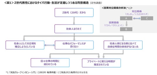 2022年に「動画は倍速」「ご飯はながら食べ」「結論だけを先に知る」ような行動とともに、タイパ(タイムパフォーマンス)が注目を集めました。そこで、現在のZ世代男性がタイパ生活をする要因はどこにあるかを探るためインタビューをしました。Z世代男性は就職して日が浅いため、社会的承認欲求から社会人としての立場を確立しようとしている時期にあたりますが、いまだに不慣れなことから、仕事のパフォーマンスが高くなく日々仕事の時間に追われ、プライベートに使える時間が限られます。加えて、学生時代はコロナ禍でプライベートを謳歌していたのが、社会人となったことで勤務や通勤の時間に逼迫されています。これがタイパ生活を定着させる背景となります。<図1>