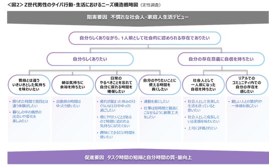 社会人・家庭人としてデビューしたZ世代男性は、不慣れな生活の中で「自分らしくありながら、1人前として社会的に認められる存在でありたい」ことを目指していました。タスク時間の短縮と自分時間の質・量の向上を図ることができるタイパ行動を選ぶことがニーズの促進要因になると分析結果から明らかになりました。<図2>