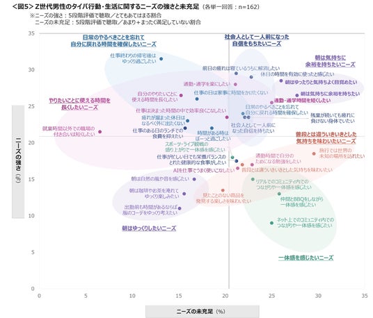男性全体に比べZ世代男性が強いニーズは、「社会人として一人前になった自信を持ちたい」「通勤時間で自分のためになる勉強をしたい」「仕事の日は家事に時間をかけたくない」「時間がある時はぼーっと過ごしたい」「スポーツ・ライブ観戦の盛り上がりで一体感を感じたい」でした。<図4>