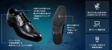 本商品は、アッパー素材には防水レザーを使用し、靴内にも浸水しにくいシートを用いたことで、水深4cmに5時間つける防水試験に合格した防水仕様の商品です。加えて、路面が濡れると滑りやすくなりますが、防滑デザインのアウトソールを採用することで、雨の日も安心・安全にお召いただけるシューズです。