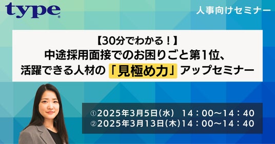転職サイト「type」では、3/5(水)・3/13(木)に【30分でわかる!】中途採用面接でのお困りごと第1位、活躍できる人材の「見極め力」アップセミナー」を開催いたします。