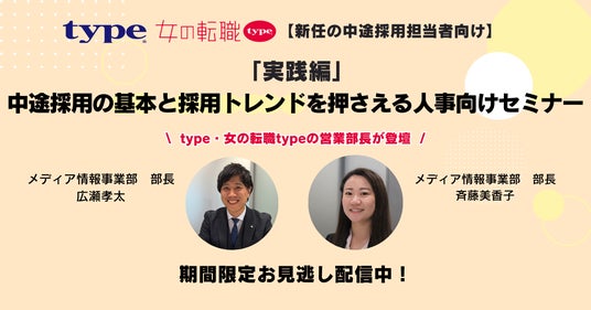 【新任の中途採用担当者様向け】第2部「実践編」中途採用の基本と採用トレンドを押さえる人事向けセミナーhttps://info.type.jp/webinar-guide/archive/entry/0062/