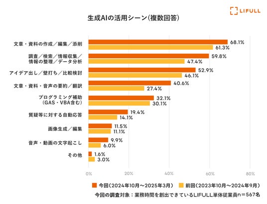 活用シーンは前回調査と変わらず「文章・資料の作成/編集/添削」が最も多く、業務時間を創出できている従業員(567名)のおよそ7割にあたる386名が活用しています。また、「調査/検索/情報収集/情報の整理/データ分析」「アイデア出し/壁打ち/比較検討」についても活用率が高い状況が継続しています。