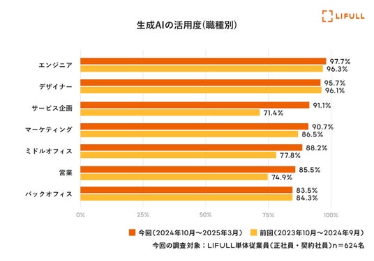職種別における生成AIを活用できている従業員構成比は、エンジニア及びデザイナー職において業務オペレーションに生成AIを組み込む等の効果により、ほぼ100%活用できている状況にあります。