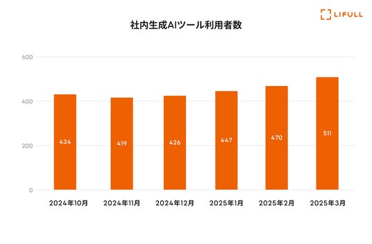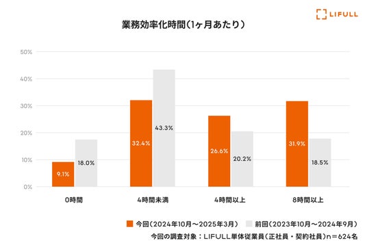 この度、2023年10月~2024年9月の1年間の集計(※2)から更に活用が進行し、2024年10月~2025年3月において、LIFULL単体従業員の90.9%が生成AIを活用し、半年間で合計31,596時間の業務効率化を実現しました。