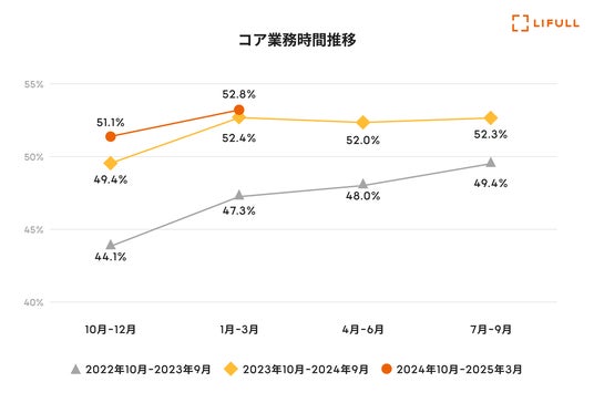 生成AIの社内活用によって業務時間を創出したことで、目標達成に繋がるコア業務の比率が上昇傾向にあり、2年間で7%向上しています。