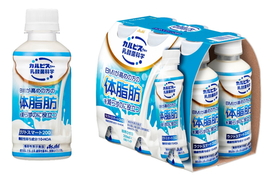 『ラクトスマート200』は、「カルピス」に由来する長年の乳酸菌研究により選び抜かれた乳酸菌CP1563株由来の10-ヒドロキシオクタデカン酸(10-HOA)を含む機能性表示食品です。乳酸菌CP1563株由来の10-HOAには、 BMIが高めの方の体脂肪を減らす機能があることが報告されています。