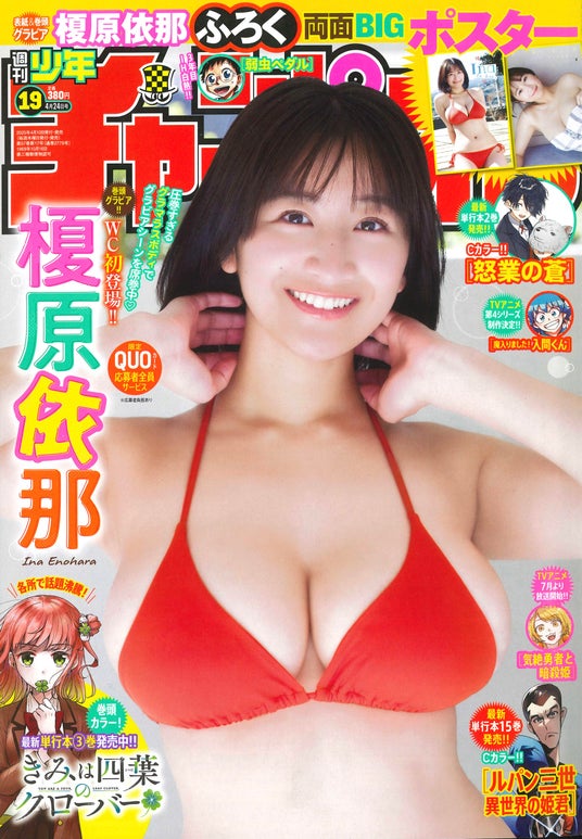 株式会社秋田書店(所在地:東京都文京区、代表取締役社長:山口徳二)は、発行している週刊少年漫画誌『週刊少年チャンピオン』(編集長:松山英生)4月10日(木)発売の19号にて、表紙&巻頭グラビアに榎原依那さんが登場することをお知らせいたします。両面BIGポスターふろく&限定QUOカード応募者全員サービス企画を実施するほか、本誌に収められなかった未公開カットを収録したデジタル写真集も同日配信開始致します。