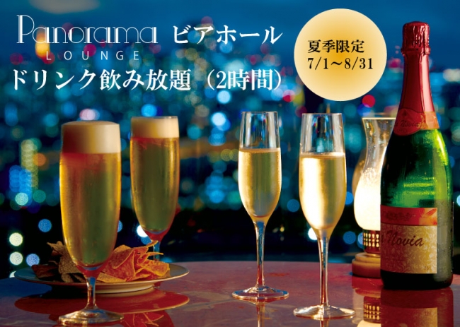 ホテル最上階の眼下に広がる夜景とともにスパークリングワインや生ビールの飲み放題で夏のひとときをお楽しみください。