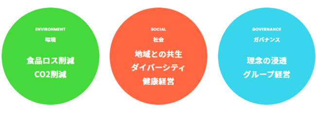 「Eat+&の幸せ」を、将来へと持続させていくために、「事業への影響」と「社会への影響」を考慮した「マテリアリティ(重点課題)」に基づき、「環境」「社会」「ガバナンス」の3つの視点より、7つの重点取組みテーマを選定いたしました。