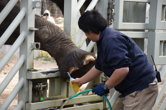 ゾウの足のケアに保湿にオリーブオイルが塗られる様子