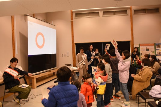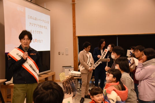 トークショー後、クイズ大会が開かれ、子どもたち15人が挑戦しました。のんほいパークに関する6問を「○」「×」で回答。田中さんのユニークなヒントに助けられる子もいました。